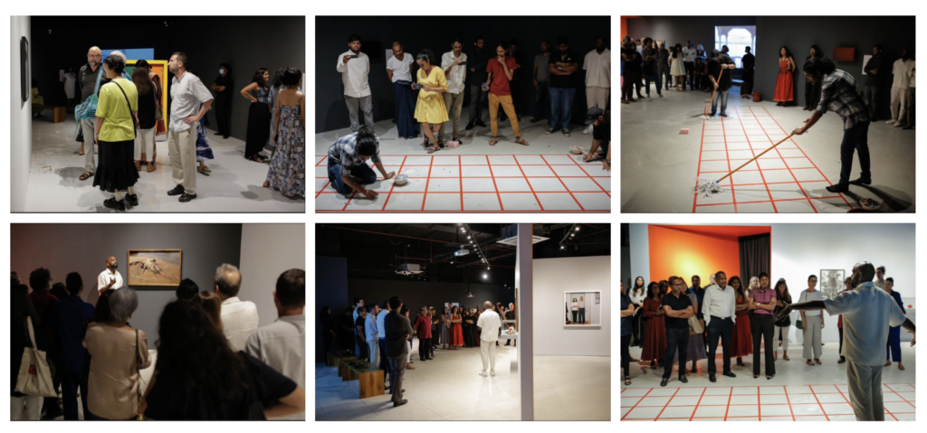 ‘The Foreigners’ features 15 contemporary artists who include Arjuna Gunaratne (b. 1976), Danushka Marasinghe (b. 1985), Dinelka Liyanage (b. 1994), Hema Shironi (b. 1991), Hania Luthufi (b. 1989), Imaad Majeed (b. 1991), Isuru Kumarasinghe (b. 1987), Janani Cooray (b. 1974), K K Srinath Chathuranga (b. 1987), Nina Mangalanayagam (b. 1980), Reginald S. Aloysius (b. 1970), S.H. Sarath (b. 1947), Shyama Golden (b. 1983), Stephen Champion (b. 1959), and Sumudi Suraweera (b. 1982). Two of the artworks titled ‘வாசல்/ එළිපත්ත/ Threshold’ (Part 1) and ‘வாசல்/ එළිපත්ත/ Threshold’ (Part 2) by Dinelka Liyanage (b. 1994), Hania Luthufi (b. 1989) and Sumudi Suraweera (b. 1982) of Music Matters, were commissioned by the MMCA Sri Lanka in 2021 with the support of the European Union. Lenders to the exhibition are based in India, Sri Lanka, Sweden, the UK, and the USA.